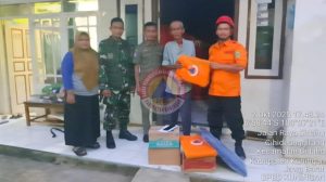Tim Pusdalops PB BPBD Kuningan menyerahkan bantuan logistik darurat kepada keluarga terdampak.